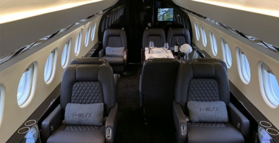 FALCON 2000 features a very large cabin, equipped with luxurious and hi-tech accessories. The interiors are meticulously studied in every detail, the bathroom is large completed with spacious compartments for the necessaire.
